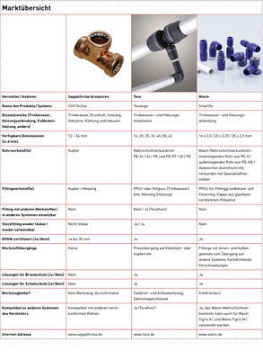 Es gibt Steckverbindungssysteme und Steckfittings. Systeme bestehen aus aufeinander abgestimmten Komponenten und es dürfen nur die zum Lieferumfang gehörenden Rohrleitungen/Werkstoffe (mit exakten Rohrdurchmessern/Maßtoleranzen) des Herstellers eingesetzt werden. Das ist ein wichtiger Faktor für den Gewährleistungsfall. Die Verwendung anderer Rohrleitungen/Werkstoffe könnte zu Undichtigkeiten führen und damit die Gewährleistung aufs Spiel setzen. In den meisten Fällen decken die Komplett-Systeme die Einsatzbereiche für Sanitär, Heizungsanbindung und Fußbodenheizung mit einem entsprechend großen Fitting- und Formteilangebot ab. Bei Steckfittings als reiner Rohrleitungsverbinder können beispielsweise Kupferleitungen in verschiedenen Dimensionen von unterschiedlichen Herstellern eingesetzt werden. Das Formteilangebot ist dabei nicht ganz so umfangreich, die Zuordnung im Gewährleistungsfall gestaltet sich schwieriger.