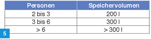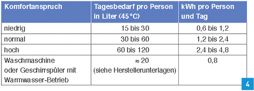 Auch hier gibt es Empfehlungen für die überschlägige Berechnung. Bild 4 weist den typischen Warmwasserbedarf pro Person – abhängig vom Komfortanspruch – für Ein- und Zweifamilienhäuser bei 45 °C Zapftemperatur aus.