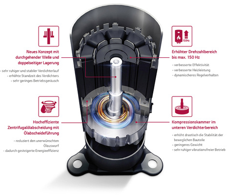 Die Bauform eliminiert damit die Stabilitätsprobleme herkömmlicher Scrollverdichter und sorgt für einen zuverlässigen Betrieb auch bei sehr niedrigen Frequenzen. So wird ein Leistungsbereich von 10 bis 150 Hz erreicht, was zu einer verbesserten Energieeffizienz bei niedrigen Teillasten führt. Zudem ist der neue Kompressor etwa 20 % leichter als frühere Modelle.