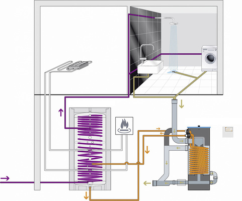 Das warme Grauwasser wird im Sammelbehälter zuerst aufgestaut und gefiltert. Über einen integrierten Wärmetauscher wird Wärme entzogen und an einen Hygienespeicher zur Vorerwärmung des Warmwassers und zur Heizungsunterstützung übergeben. Für die Nacherwärmung des Hygienespeichers nennt der Hersteller eine Einsparung von bis zu 25 %. Die Analogie zur solarthermischen Warmwasserbereitung bedeutet keineswegs entweder oder, sondern vielmehr ein optionales Kombinationspotenzial, um die Energieeinsparung zur Trinkwassererwärmung – zumindest während der Sommermonate – weiterhin zu optimieren. Was liegt also näher, als eine Vorerwärmung des Warmwassers aus der „Restwärme“ des just gebrauchten Grauwassers zu generieren. Dieses Wärme-Recycling entspricht voll und ganz dem Begriff regenerativ, dezentral und höchst effizient.