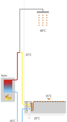 In der Schweiz wurde in jüngster Zeit eine moderne Duschwanne entwickelt, deren Funktion ebenso einfach, wie naheliegend ist. Das warme Duschwasser, welches vom Körper über die Oberfläche der Duschwanne in den Entwässerungsanschluss gelangt, wird bereits in der Duschrinne mit einer speziellen Siphonierhaube gleichmäßig über einen Wärmetauscher geführt, der dem warmen Duschwasser die Wärme entzieht. Die horizontale Tropfkante sorgt auch bei hohen Abwasserströmen für eine perfekte Benetzung des Wärmetauschers. Anschließend fließt das nun abgekühlte Duschwasser in die Entwässerung (Grauwasserstrang).