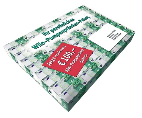 Leitmotiv des „Wilo-Pumpenprämien-Paket“ ist ein auffälliger roter Störer mit der Kernbotschaft „Jetzt mindestens € 100,– KfW-Pumpenprämie sichern!“ bzw. „Jetzt 25 % KfW-Pumpenprämie sichern!“, der sich auf allen Werbemitteln befindet. Das Paket deckt alle Phasen der Kundenansprache und -beratung und sogar das Ausfüllen des Förderantrags nach dem Pumpeneinbau ab.