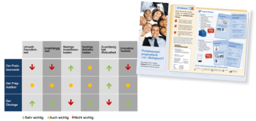 Als Ergebnis dieser Überlegungen kristallisierten sich drei Kundentypen heraus: der Preisbewusste, der Pragmatiker und der Ökologe. Die Zuordnung zum jeweiligen Typ geschieht anhand von sechs Themen, bei denen die Kunden aus jeweils drei Antwortalternativen diejenige auswählen, die ihrer Einstellung am besten entspricht. Den drei Kundentypen stehen zehn unterschiedliche Heizsysteme mit einer Reihe möglicher Systemkombinationen gegenüber, die der „Heizsystem-Navigator“ den einzelnen Typen als für sie geeignet empfiehlt.