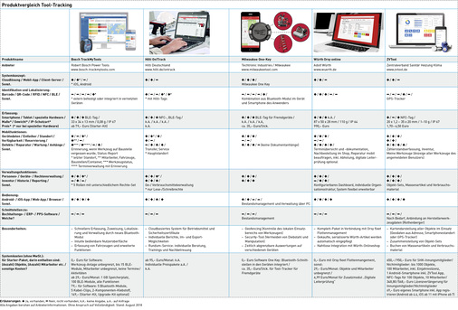 Alle Systeme versprechen, die Produktivität im Arbeitsablauf zu steigern, den Werkzeugschwund auf Baustellen zu reduzieren und teilweise auch die Inventur zu erleichtern. Doch jede Lösung hat ihre Stärken und Schwächen. Neben bekannten Werkzeugherstellern wie Bosch, Dewalt, Hilti, Milwaukee oder Würth gibt es auch Lösungen von Soft- oder Hardwareanbietern wie Finderbox, Tool Tracker.net oder Untouch. Die meisten nutzen die zunehmende Verbreitung von Smartphones und Tablets auf der Baustelle und die Möglichkeiten der Vernetzung über das mobile Internet. Wer seine Betriebsmitteldaten nicht in der Cloud speichern möchte, kann auch auf nicht cloudbasierte Lösungen zurückgreifen, beispielsweise auf Tool Tracker.net. Dafür muss allerdings eine lokale Verwaltungssoftware auf dem Büro-PC installiert werden, die regelmäßig aktualisiert werden muss. Mobil erfasste Daten müssen außerdem abgeglichen werden, sobald eine WLAN-Verbindung vorhanden ist.