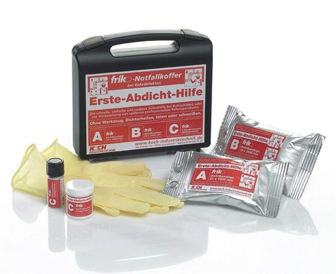 Bei größeren Leckstellen wie Löchern oder großen Rissen kommt der Friko-Dichtspachtel zum Einsatz, ein schnell aushärtendes Zwei-Komponenten-Material. Es soll auf nahezu allen Materialien haften und selbst bei anhaltendem Wasseraustritt während der Reparatur einsetzbar sein. Je nach Größe und Form der zu verschließenden Leckstelle wird die Konsistenz der Spachtelmasse gewählt. Drei Teile Pulver zu einem Teil Härter ergeben eine zähe, pastöse Konsistenz für das Verschließen von größeren Löchern. Durch die Verwendung von weniger Pulver sei das Material gießfähig und so auch für das Abdichten von tiefen Rissen einsetzbar (z.B. undichte Klebestellen bei Kunststoffrohren). „In vielen Fällen ist die Abdichtung die beste Vorbereitung für einen zweiten Termin beim Kunden, um gegebenenfalls einen kompletten Rohraustausch vorzunehmen“, erklärt Friedhelm Koch, Geschäftsführer von Koch Industrietechnik. Der Notfallkoffer ist in verschiedenen Ausführungen erhältlich. Die Standard-Variante enthält: