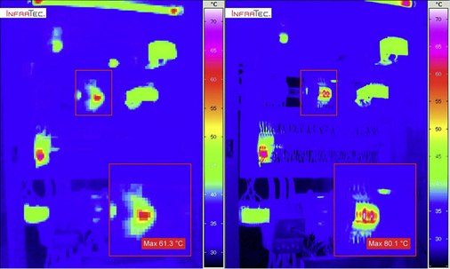 Der Auswertungsteil sollte die Wärmebilder und Digitalfotos enthalten, inklusive Aufnahmeort, Aufnahmedatum, Aufnahmeuhrzeit und Dateiname. Erkannte Fehlstellen oder Hotspots sollten im Wärmebild mit einem Temperaturmesspunkt versehen sein, wobei zu beachten ist, dass jeder Hotspot einen anderen Emissionsfaktor haben kann. Zu den weiteren Pflichtinhalten gehören eine Objektbeschreibung (Gebäude, Raum, Anlage, Schaltschrank, Schaltfeld, Bauteil etc.) sowie der Belastungszustand zum Messzeitpunkt in Ampere und/oder in Prozent zur Maximalbelastung. Letzterer Wert sollte bei 30 % bezogen auf die Nennbelastung liegen, damit Fehler erkannt werden können.
