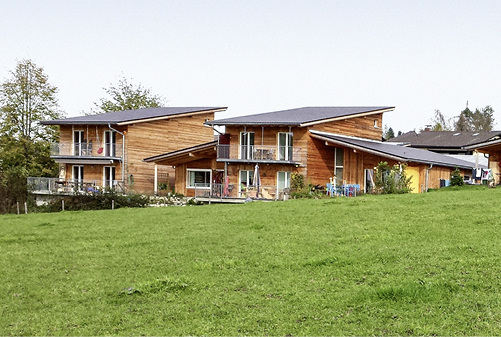 Die vom Architekten Hans Fritz geplanten Holzhäuser einer Mehrgenerationensiedlung in Bad Endorf werden mit Wärmepumpen- und Photovoltaik-Technik versorgt. Ein Haus mit drei Bewohnern darf für Heizung und Warmwasser maximal 300 Euro Strom pro Jahr verbrauchen. Erreicht wird das unter anderem durch die kontrollierte Wohnraumlüftung mit Rückgewinnung der Energie in der ausgetauschten Luft. Im Betrieb sind hier die Abluftwärmepumpen F470 von Nibe, konzipiert für den Einsatz in Häusern mit sehr geringem Wärmebedarf oder für Wohnungen in Mehrfamilienhäusern.