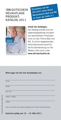 Erneut gibt es zur ISH gegen Gutschein einen druckfrischen Barrierefrei-Katalog zum Mitnehmen. Die umfangreiche Neuauflage gibt den derzeitigen Stand zum Produktsortiment wieder. Die Print-Fassung wird auch weitere Monate aktuell bleiben. Darüber hinaus bietet der Onlinekatalog aktualisierte Daten und listet, wenn verfügbar, weitere Varianten auf.