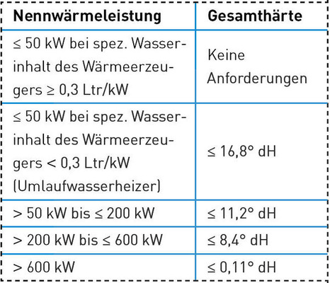 – für Umlaufwasserheizer (wandhängende Heizgeräte) bis 50 kW bei spezifischem Wasserinhalt des Wärmeerzeugers „kleiner 0,3 Liter pro kW, wenn die Wasserhärte „16,8 Grad Deutsche Härte“ nicht überschritten wird.