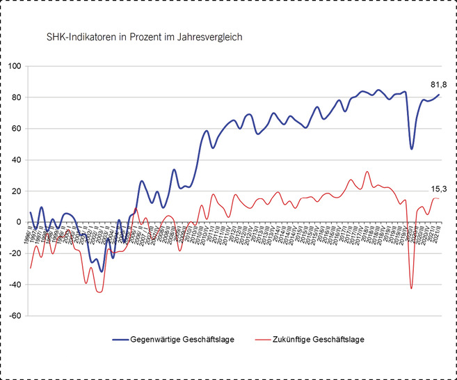 Die SHK-Innungsbetriebe bestätigen aufs Neue eine deutlich positive Geschäftslage. Aus dem Erhebungszeitraum vom 14. bis 27. Juni 2021 konnten Meldungen von 1742 Innungsbetrieben ausgewertet werden. Dabei zeigt sich, dass die aktuelle Geschäftslage mit einem Indikatorwert von nunmehr +81,8 % deutlich positiver eingeschätzt wird, als dies unter dem Eindruck der Pandemie vor einem Jahr verzeichnet wurde (+67,4 %). Auch die zu erwartende Geschäftslage in den nächsten drei Monaten kommt auf positive Indikatorwerte. Dabei führt das Heizungsgewerk mit 24,2 %, gefolgt von Kundendienst (24,1 %) und Sanitär (14,0 %).