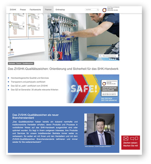 Der Zentralverband hat die Onlinepräsenz seiner Gewährleistungsmarke „ZVSHK-Qualitätszeichen“ überarbeitet. Im Fokus standen dabei die Verbesserung der Nutzerführung, die Umsetzung von Feedback-Möglichkeiten sowie die Darstellung umfangreicher Hintergrundinfos zu den Vorteilen des Qualitätszeichens für Handwerksbetriebe. Eingebettet in die neuen Webseiten von www.zvshk.de/qualitaetszeichen sind zudem zahlreiche Statements in Wort und Videobild von Beteiligten aus den Reihen der Verbandsorganisation und der bisher zertifizierten Hersteller.