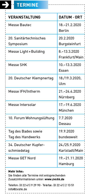 Einige SHK-Landesverbände starten bereits im ersten Quartal mit einer mehrstündigen Infoveranstaltung, die von einer kleinen Produktausstellung begleitet wird. Erläuterungen zu „Smart Living im Heizungsmarkt“ und bereits feststehende Termine finden Mitgliedsbetriebe unter www.zvshk.de (im Suchfeld den Quicklink QL78123584 eingeben).