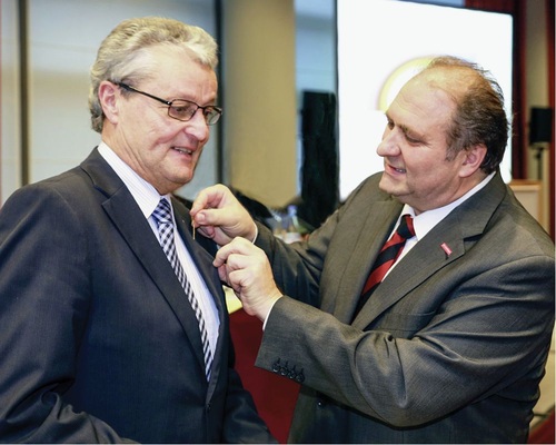ZVSHK-Präsident Manfred Stather bekam im Rahmen der Mitgliederversammlung das Handwerkzeichen in Gold durch ZDH-Präsident Hans Peter Wollseifer verliehen. In seiner Laudatio charakterisierte Wollseifer Manfred Stather als einen Kollegen, der „nach außen Handwerk und Betriebe eloquent vertritt, nach innen pragmatisch wirkt und dabei die Zukunft fest im Blick hält. Seine Argumente finden Gehör, ob es um Nachwuchssicherung geht, Demografie oder Energiewende.“